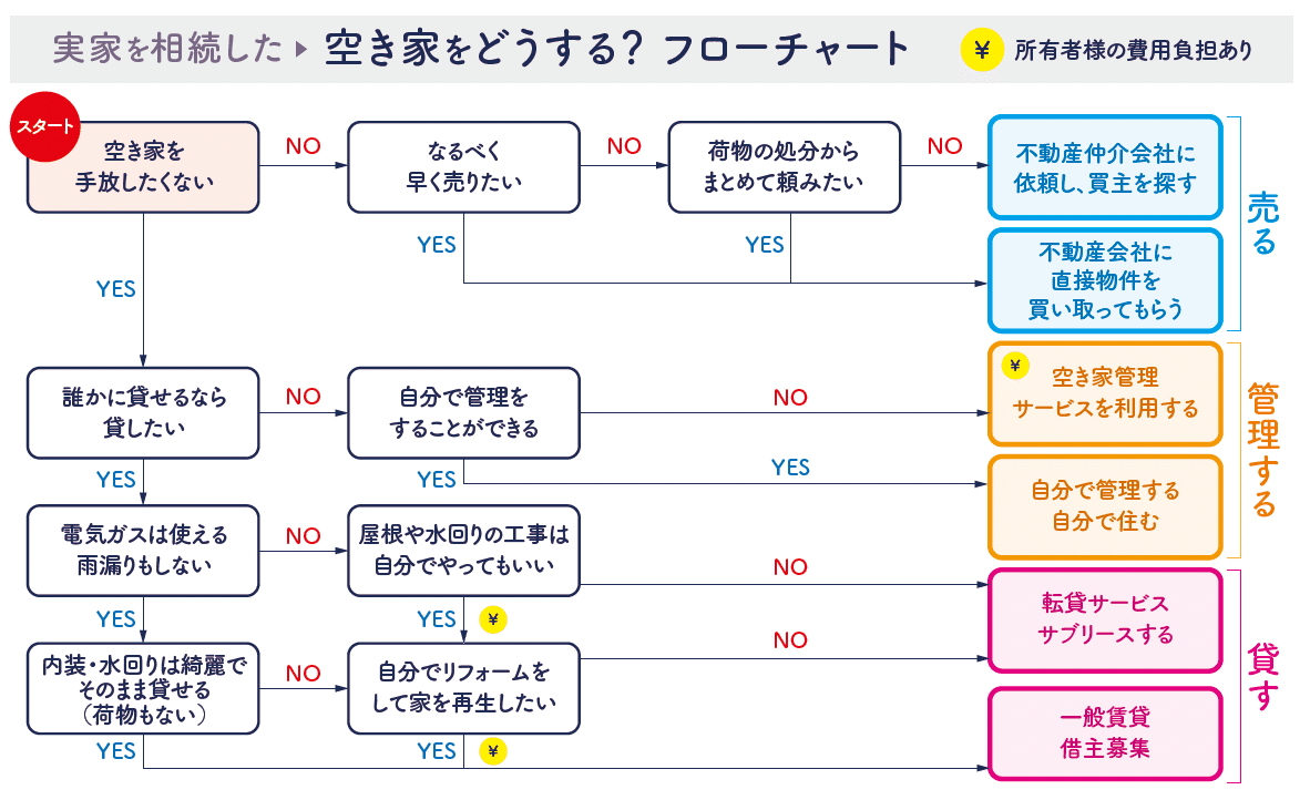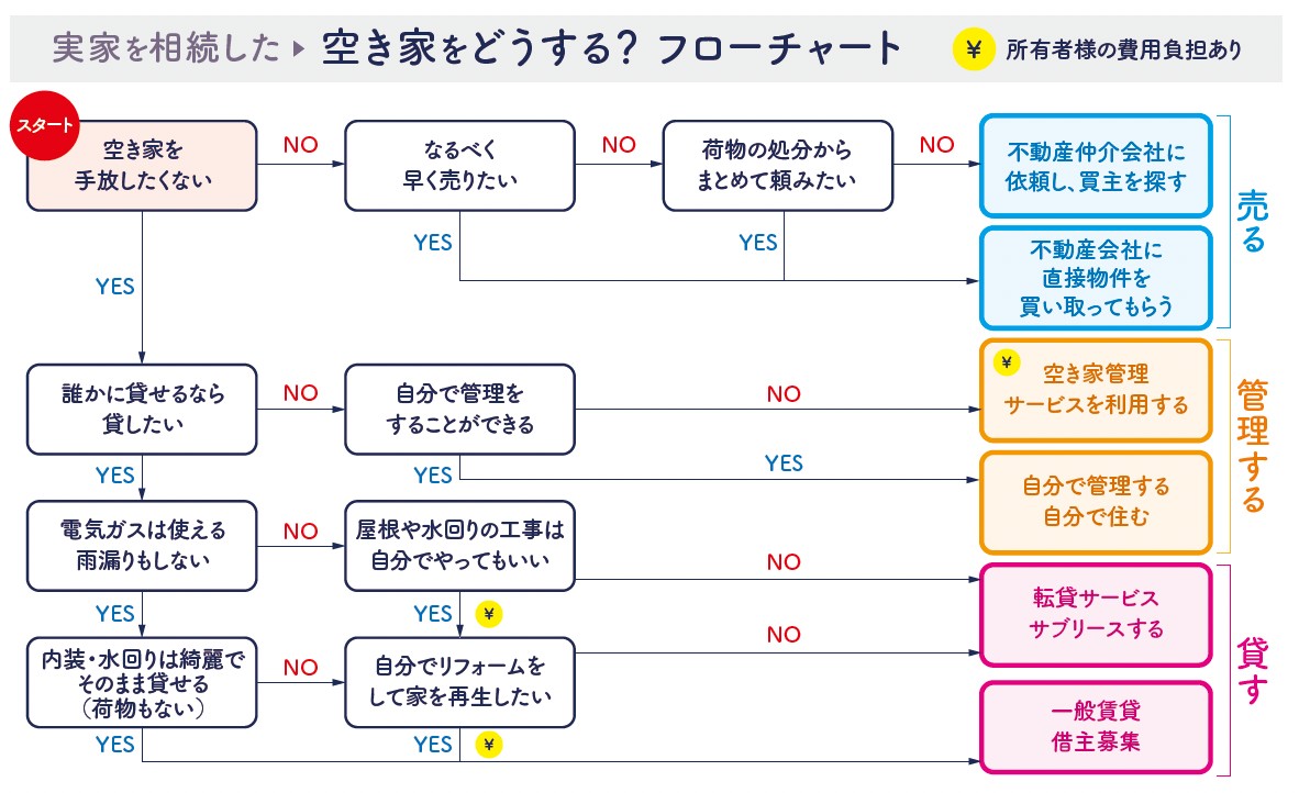 一緒に空き家をどうするのかフローチャートを見ながら考えましょう。